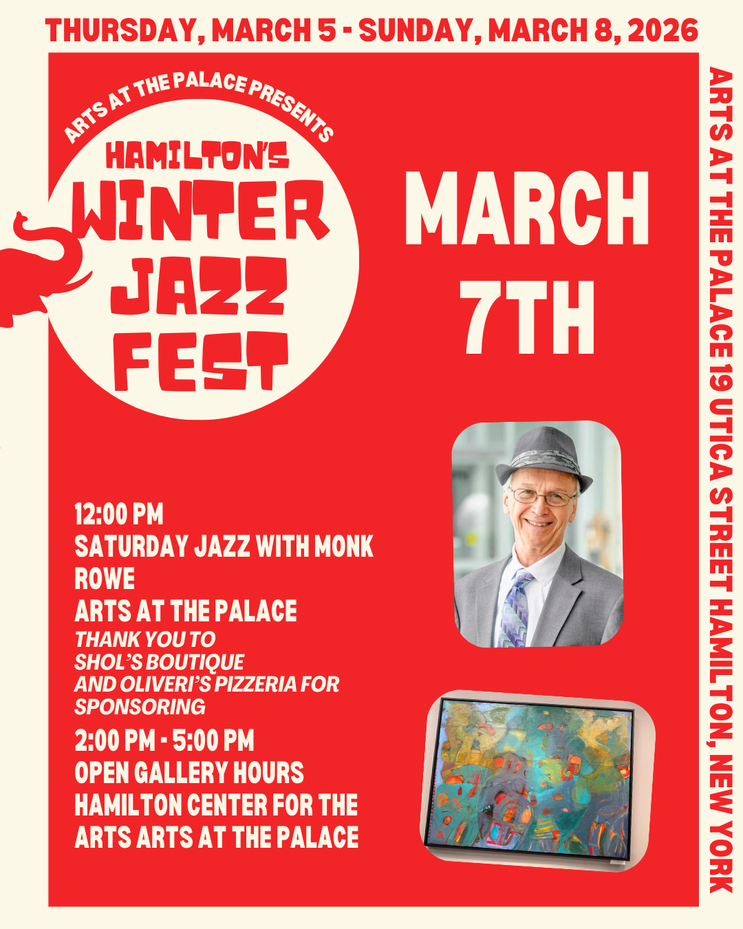 Open Gallery hours Saturday, March 7, 2026 2:00 PM 5:00 PM Hamilton Center for the Arts & Arts at the Palace Hamilton, NY 13346 (map) Google Calendar ICS Open gallery hoursHamilton Winter Jazz FestDate: Saturday, March 7th, 2026Time: 2:00 pm - 5:00 pmLocation: Hamilton Center for the Arts & Arts at the PalaceVisit art galleries and explore special exhibitions featuring works by Diana Godfrey at Hamilton Center for the Arts and Jill Sziliga & Ryan Stewart at Arts at the Palace.